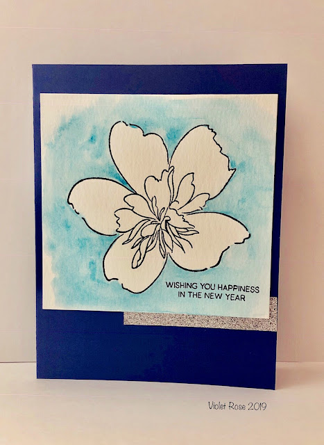 The stamp set I used is from Altenew Floral Art. This set has a large flower for stamp layering or you could just stamp the large flower outline and color the flower. For this card, I colored outside of the flower with blue watercolor and added a silver stripe underneath the flower panel to draw attention to the sentiment.